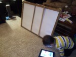 - Behind the scenes for some prop assembly. I made the frame from scrap wood, tacked poster board to it, taped the people photos on it, used black construction paper to create the “frame” between the people (and then black face paint when I ran out of paper) while managing to avoid injuring my son who is playing Super Why. If I tried this hard in the rest of my life I would probably be pretty successful.