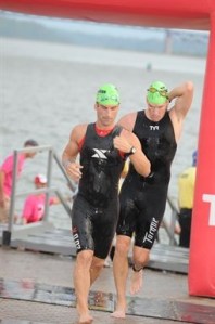 Louisville has a time trial start where one by one you jump off a dock into the Ohio River. It’s very organized and the line moves quickly, but there is certainly a mad dash to get in line ASAP so you aren’t near the back which creates a lot of artificial stress. Brady and I flew through transition set-up, made the 15 minute walk to the swim start and we were in line by 5:30 a.m. and were probably 300 people back. The people up front had blankets and lawn chairs as if they had been there for days. It reminded me of Brady camping out for Celine Dion tickets a few years ago (I kid, I kid). While I didn’t really care for the TT start, it was still a pretty neat sight as the sun was rising to watch the first few hundred people run up the dock and leap off in chase of glory.