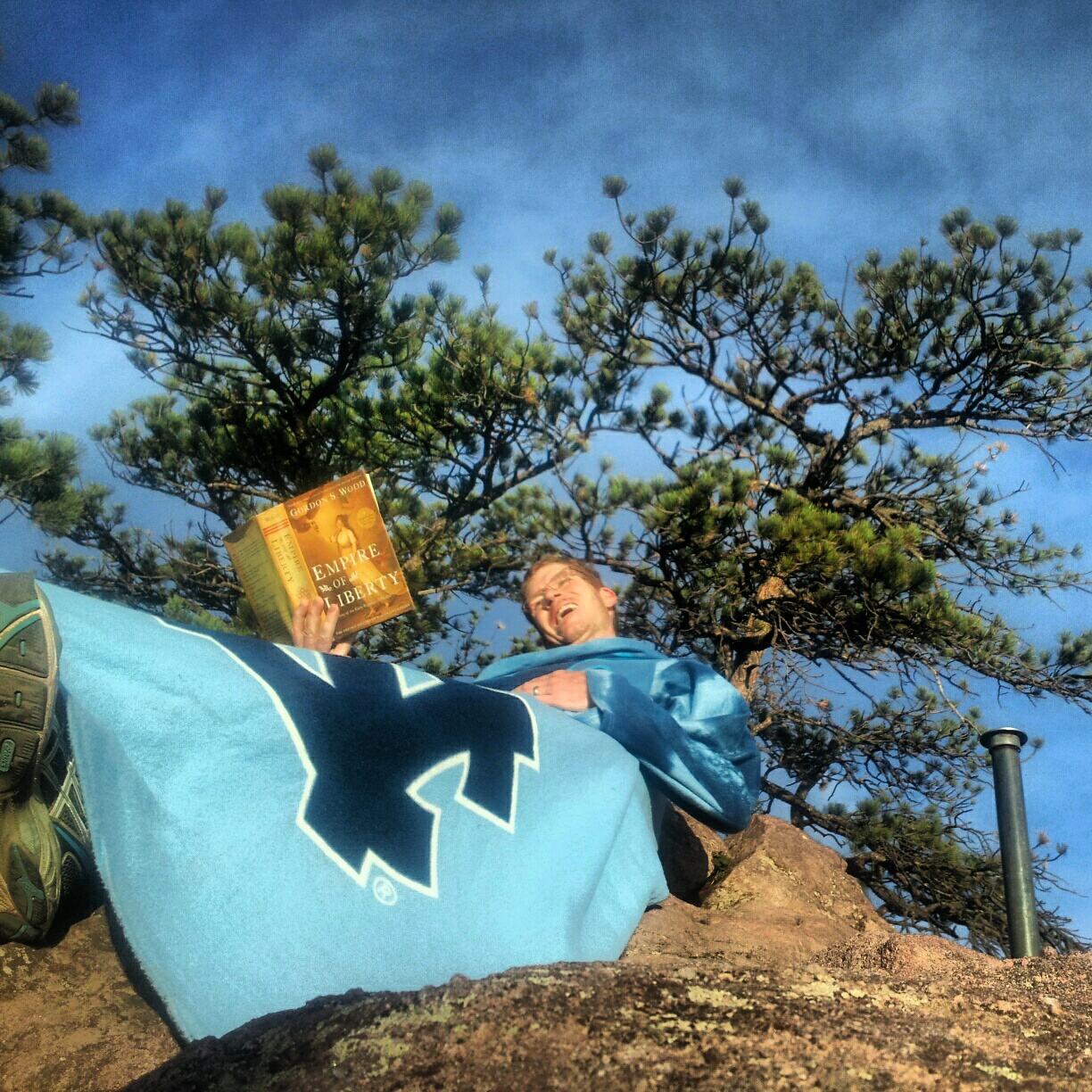 14th Run (10/12) The Snuggie Run Published October 19, 2012 at 1224 × 1224 in Mount Sanitas Fun Run Friday – A Foolish Exercise ← Previous Next → Enjoying a book and a laugh snuggie style at the summit.