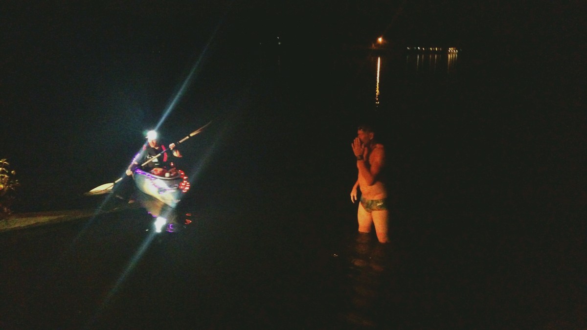 The finish. There was actually a fisherman there who must have thought it was strange to see a man emerge from the darkness in a Speedo. Cam had the most difficult navigation task in the widest part of the lake and doing it at night and GPS says the dude did pretty doggone good.
